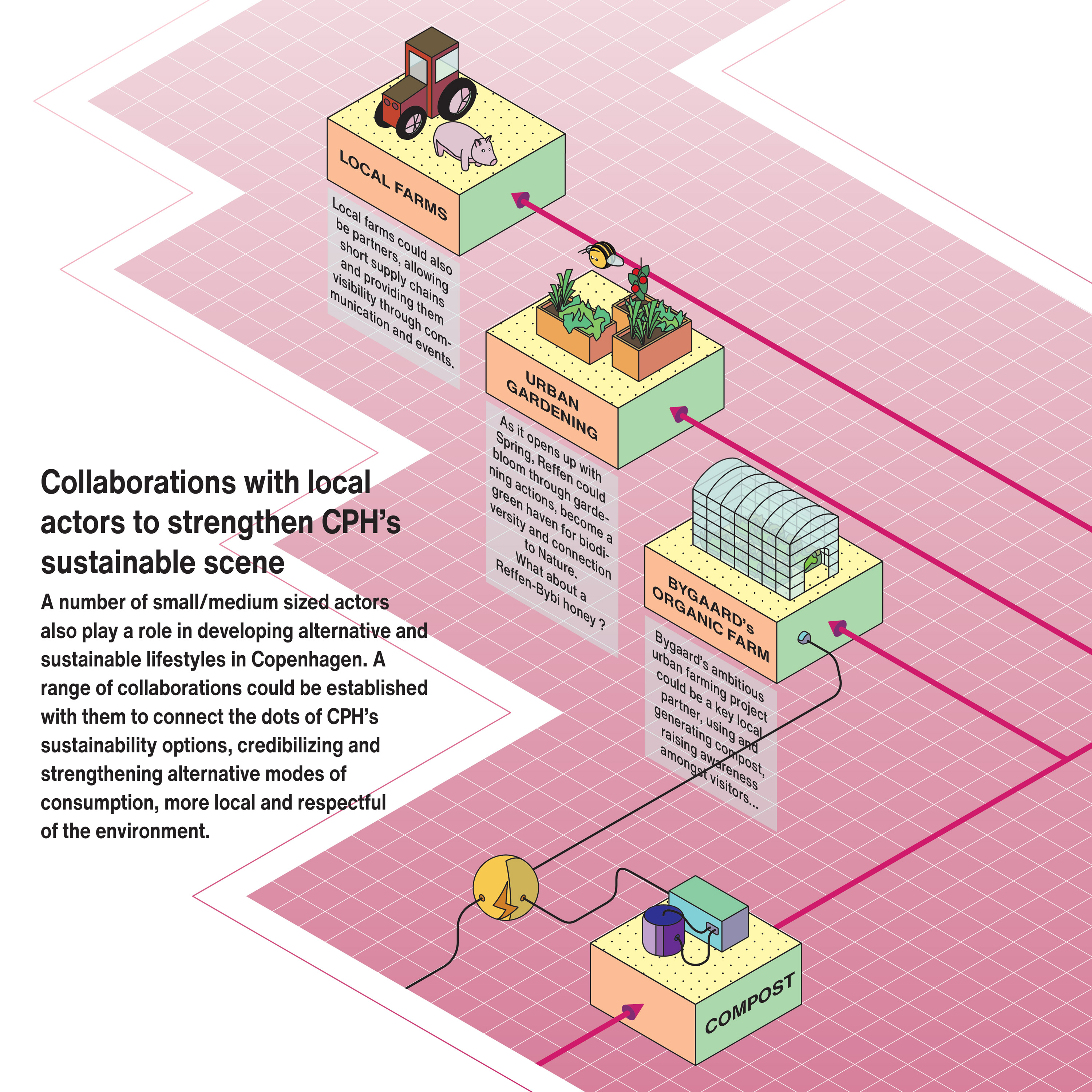 This short, self-initiated project aimed at developing a visual language to best communicate scenarios of circular economy and short supply chains. Taking Reffen and the neighbourhood of Reffshaleøen as a concrete ground to this experiment, I imagined and visualized connections between local actors to delineate a basic scenario of circular economy.