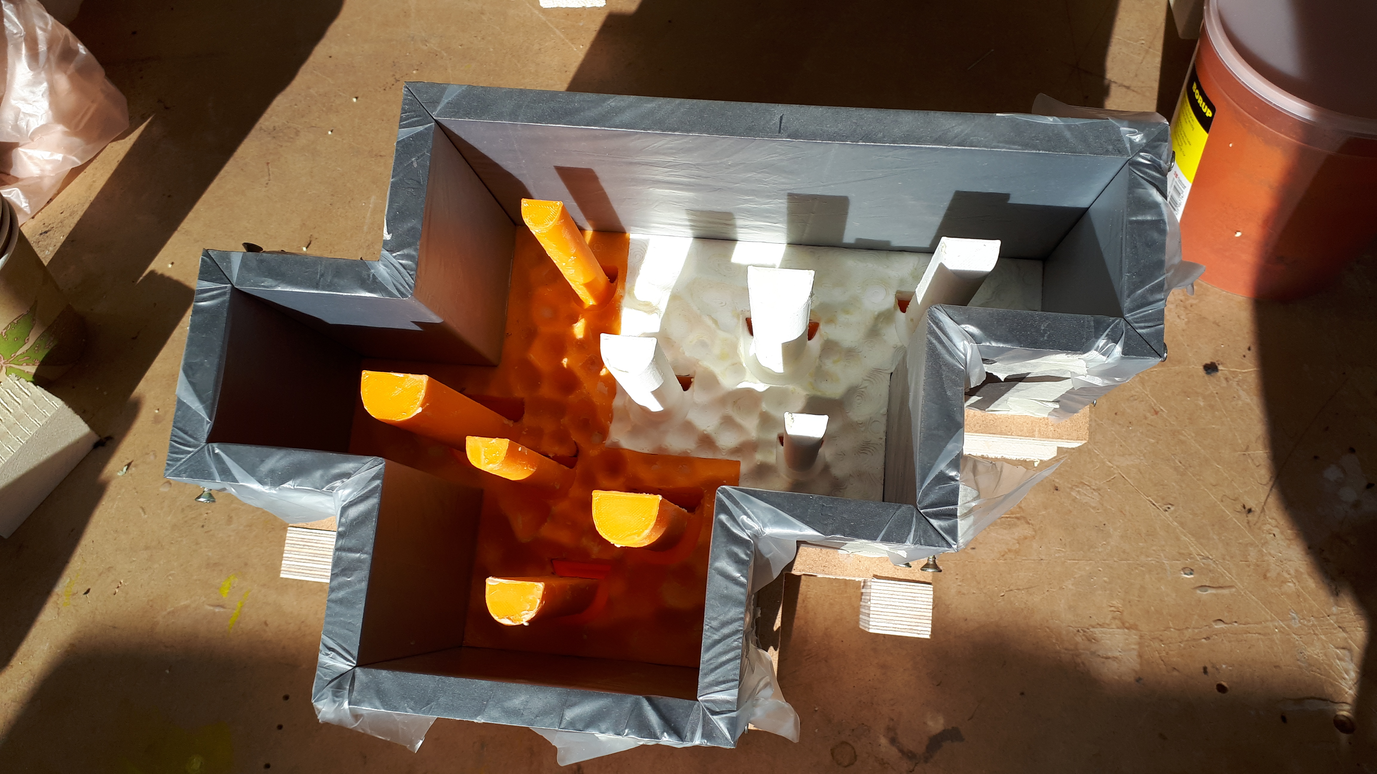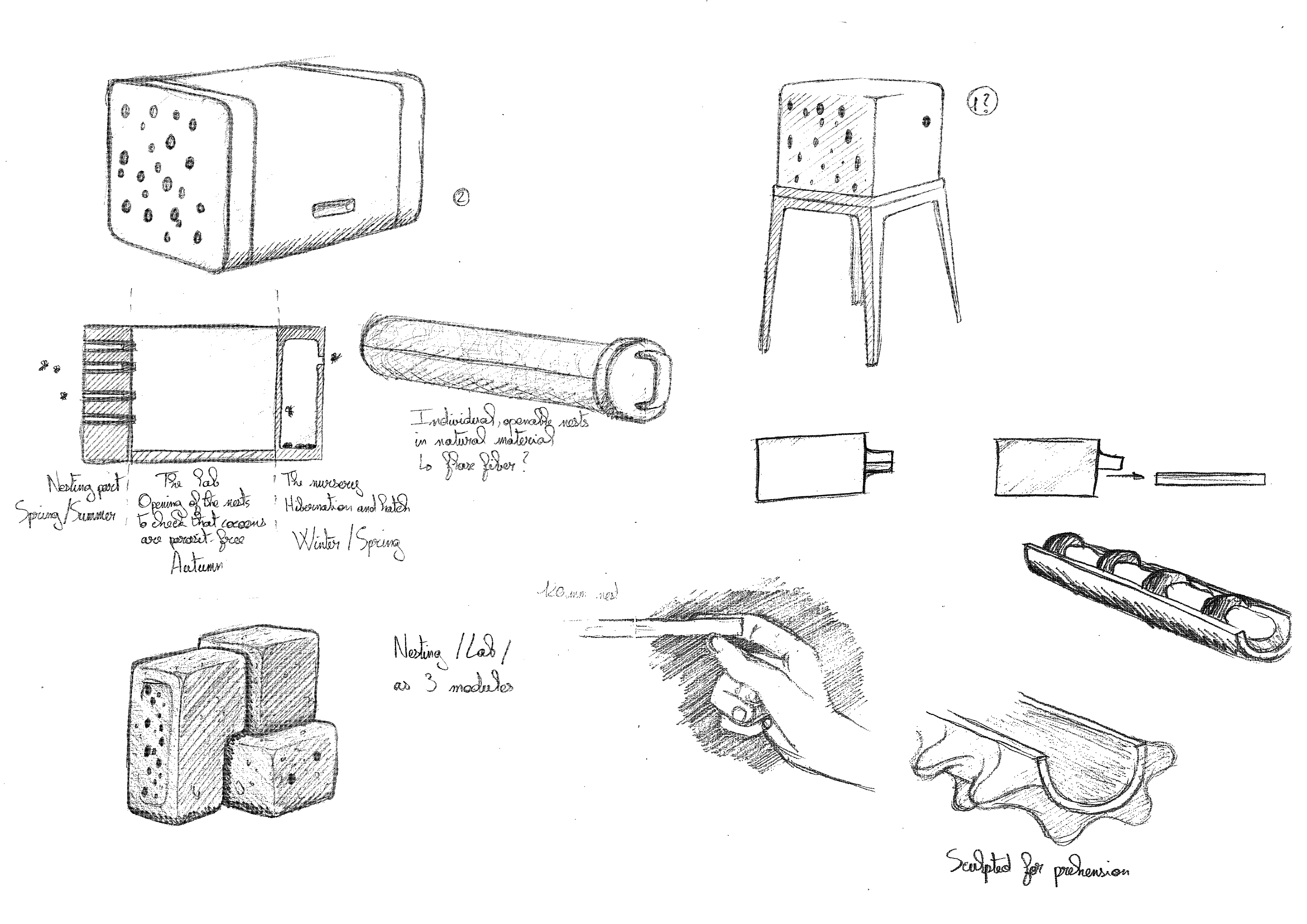 Successive iterations of modeling, prototyping and material exploration followed, on a quest to determine the optimal pattern and molding technique. These tests and some failures experienced along the way informed several redesigns. For instance, the overhanging nest shelter had to be shortened and rationalized after it proved very delicate to demold.
